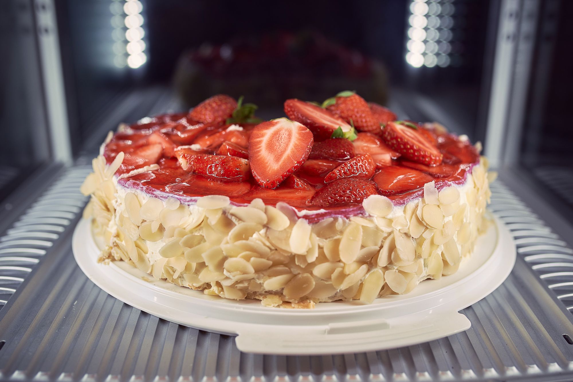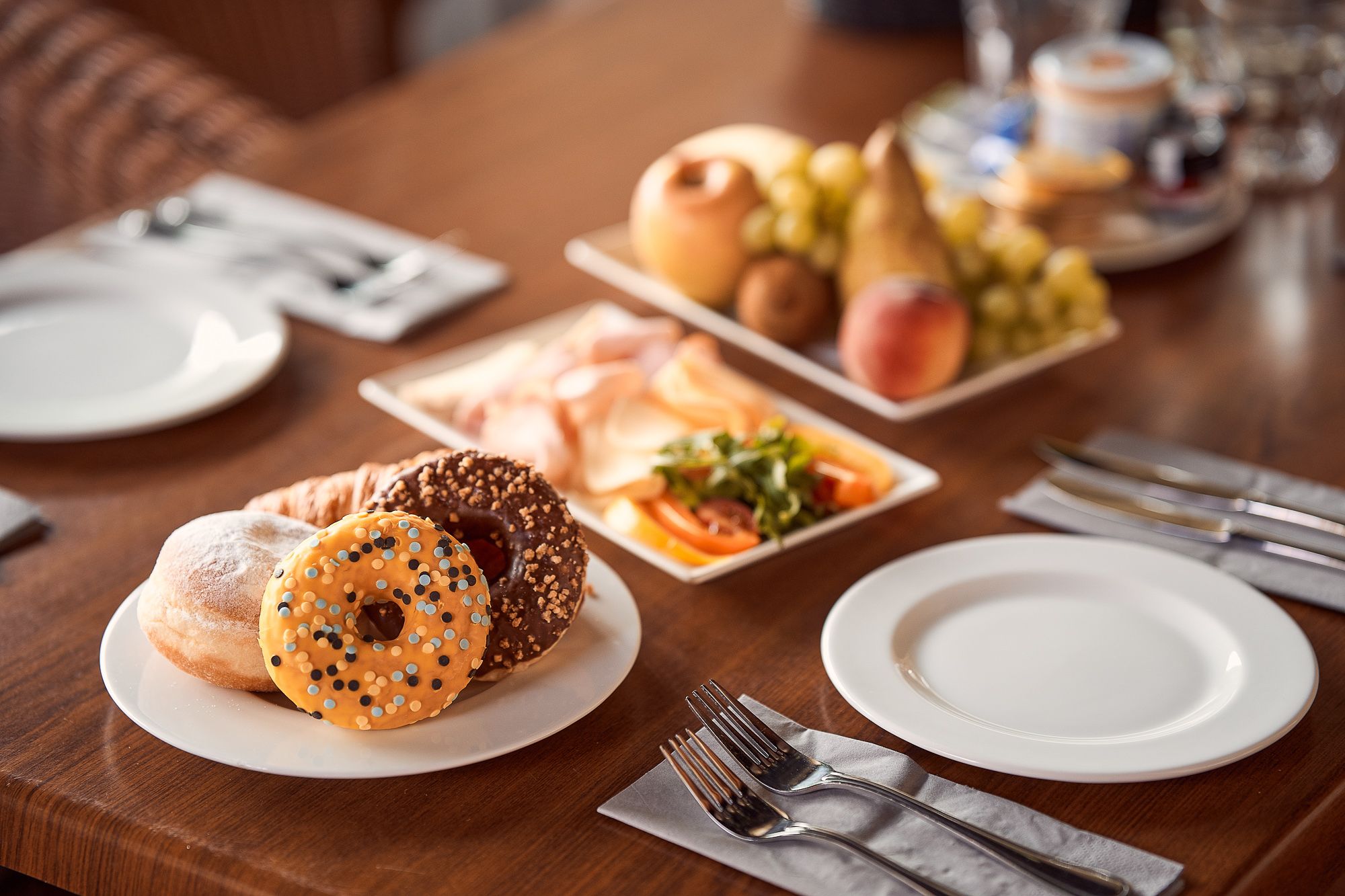 Bohatá snídaně podávaná formou švédských stolů, obsahující teplé jídlo (vajíčka, párky, fazole), obložené studené mísy, výběr pečiva, ovoce, zeleninu a teplé i studené nápoje.